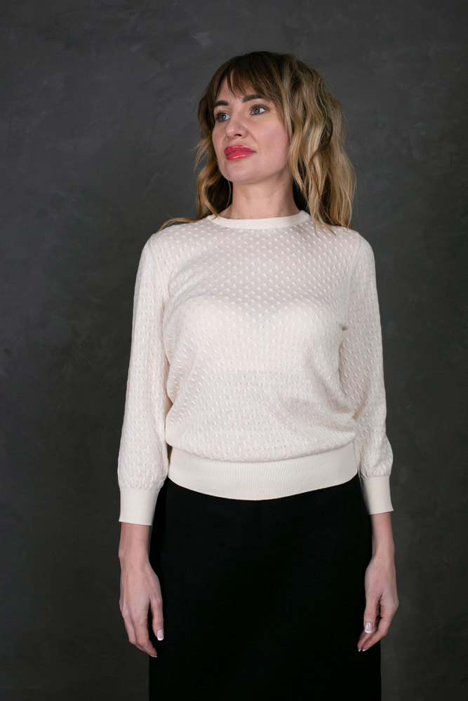 Трикотажний в*язаний джемпер фактурного переплетення. Джемпер з круглою горловиною та рукавами довжиною 7/8. Склад сировини: 85% бавовна+15% кашемір.